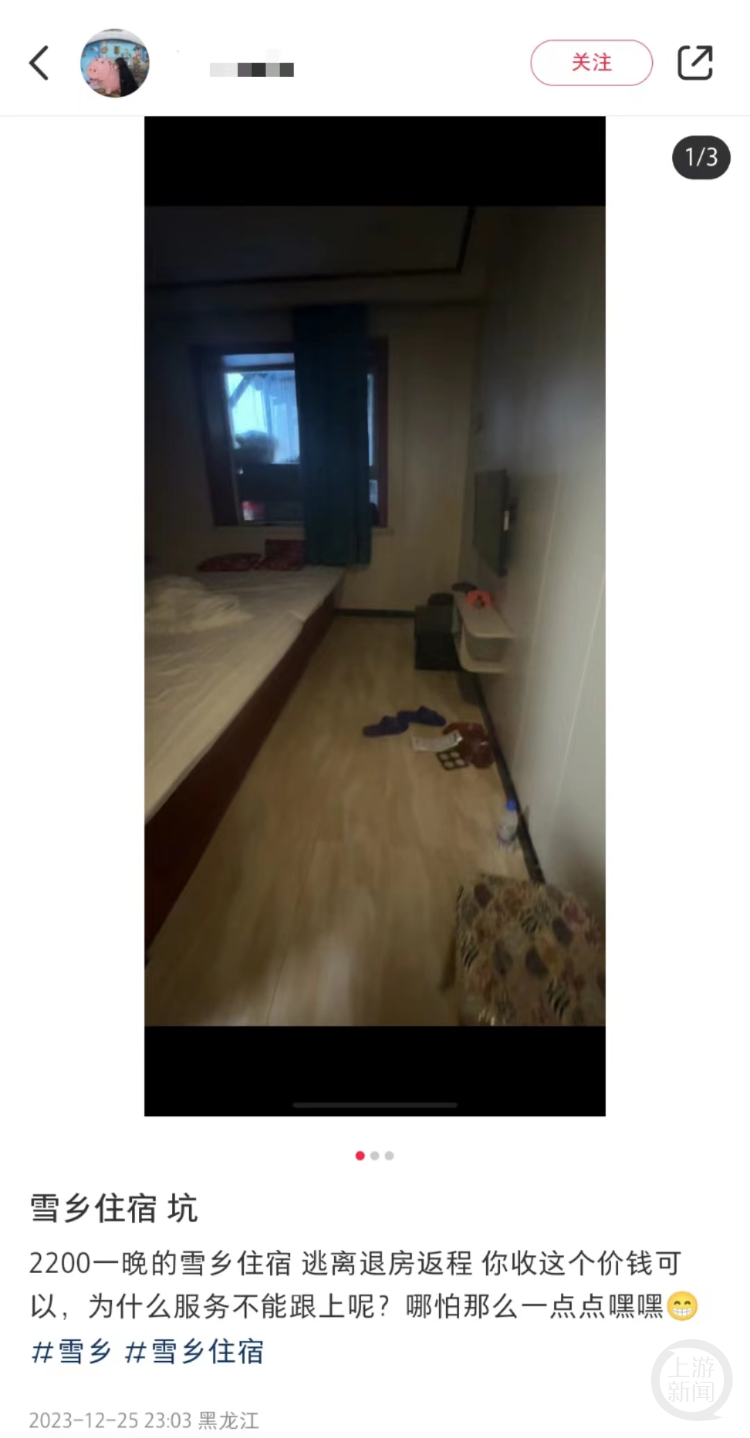 另外一名浙江网友也在12月25日发帖,表示在雪乡住宿时踩坑,“2200元一晚的雪乡住宿,你收这个价钱可以,为什么服务不能跟上呢?”她告诉记者,这次在雪乡所住的酒店房间内有臭味,一直不清楚来源,“开始以为是下水道返臭,直到离开也没搞懂为什么。店家的服务态度也非常一般。”